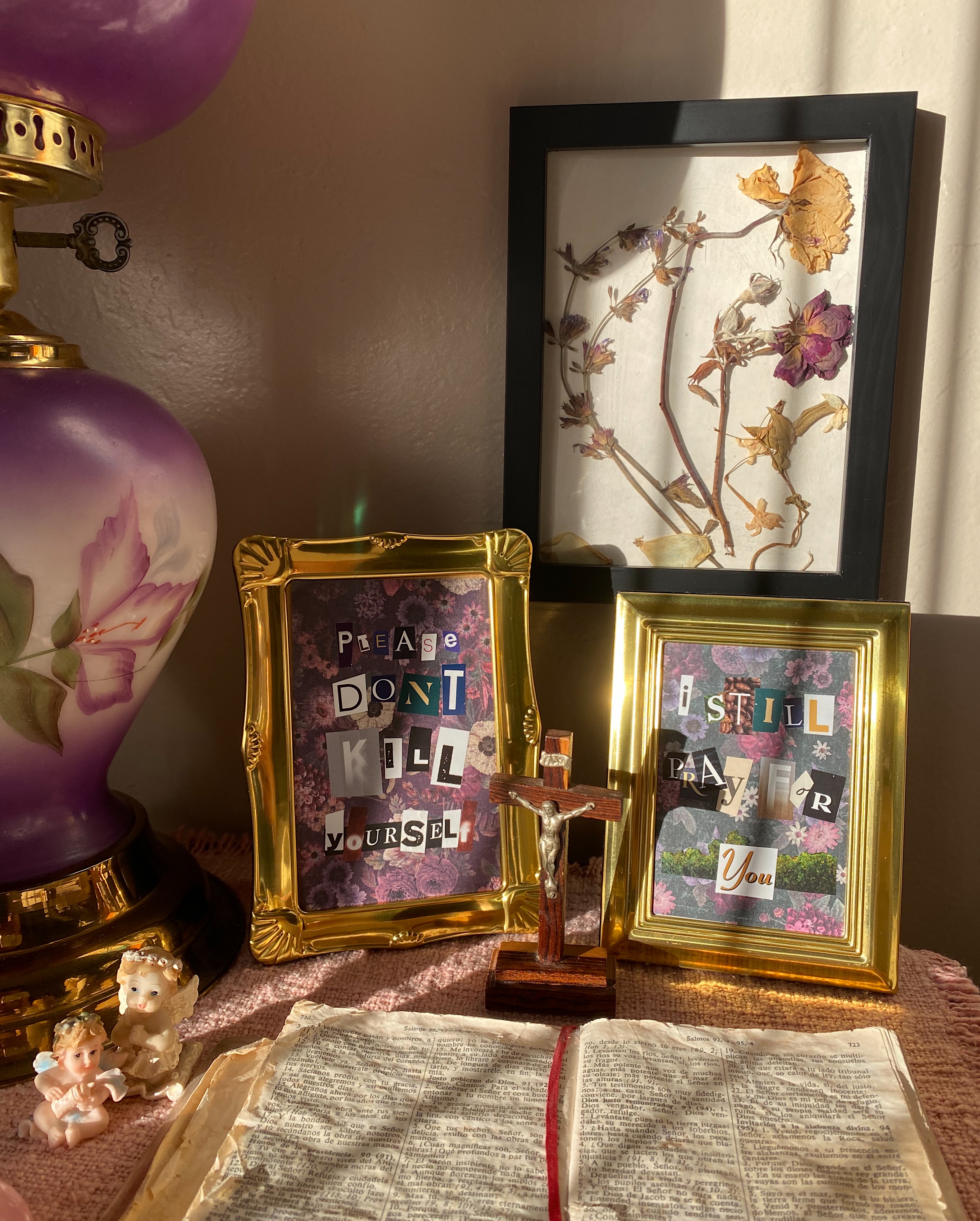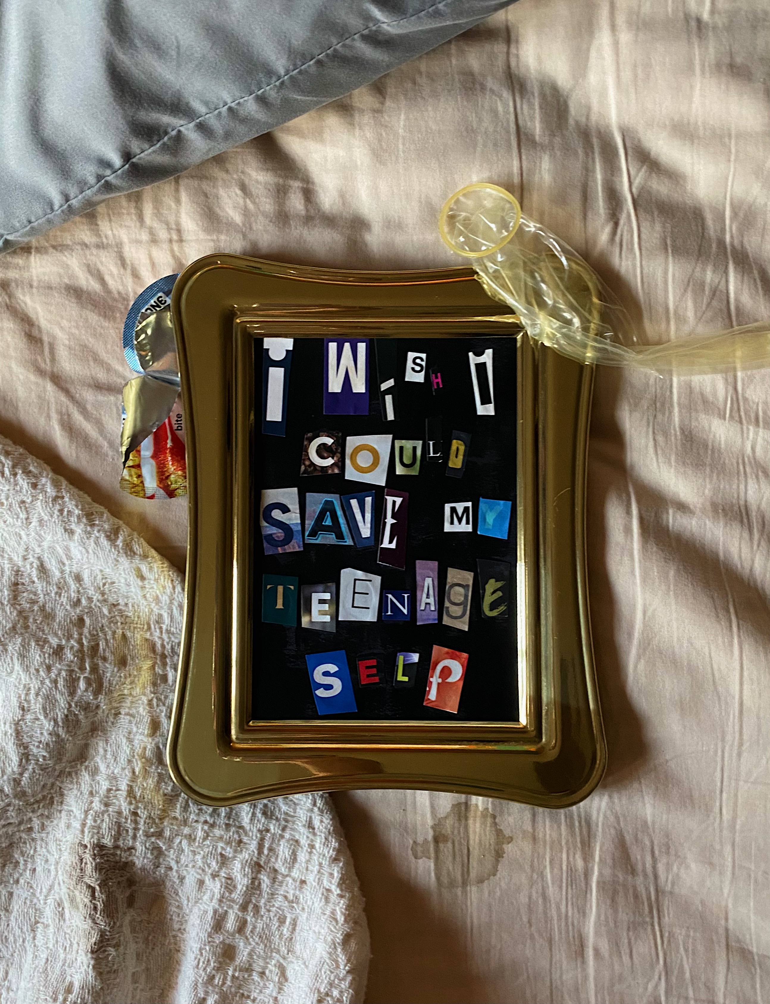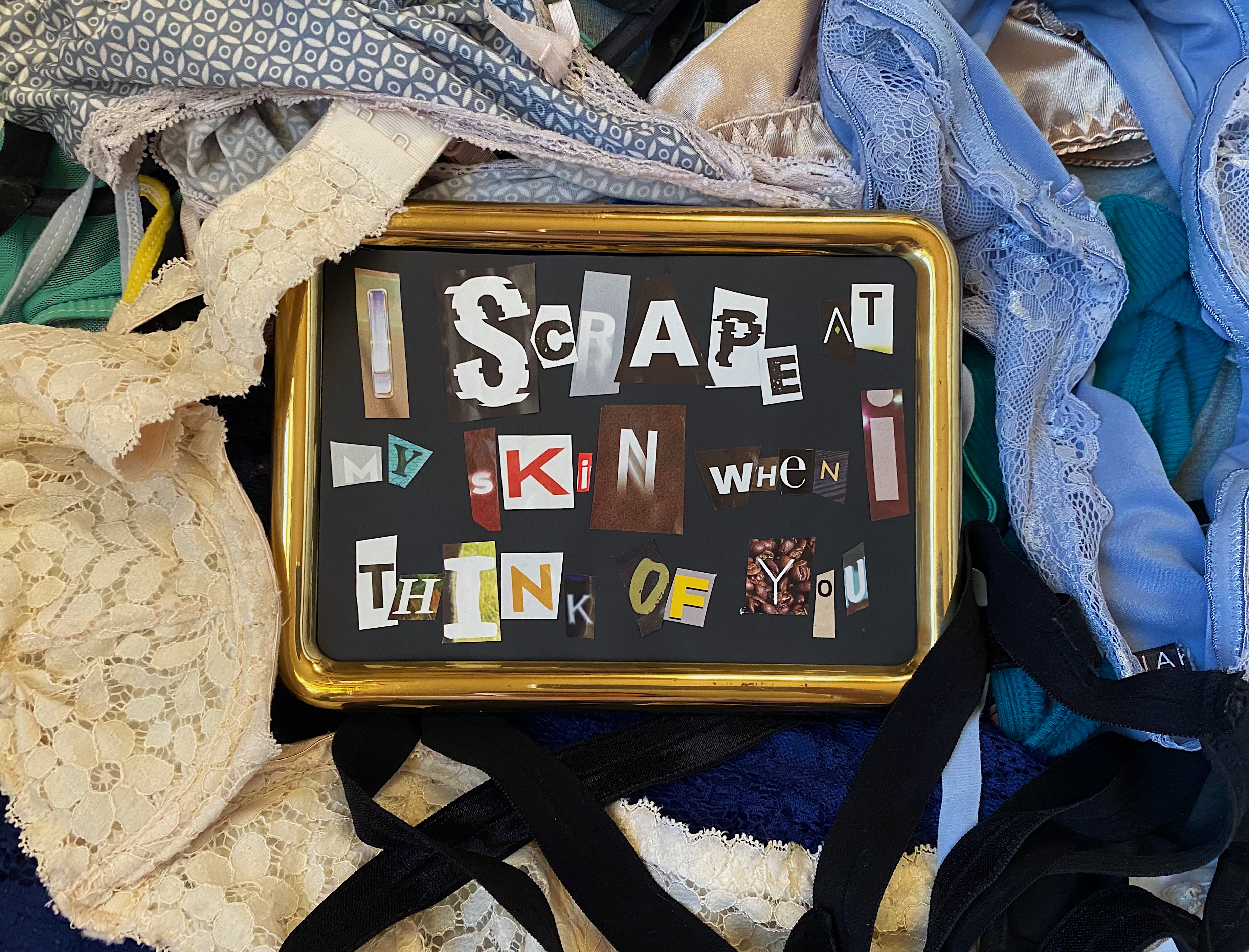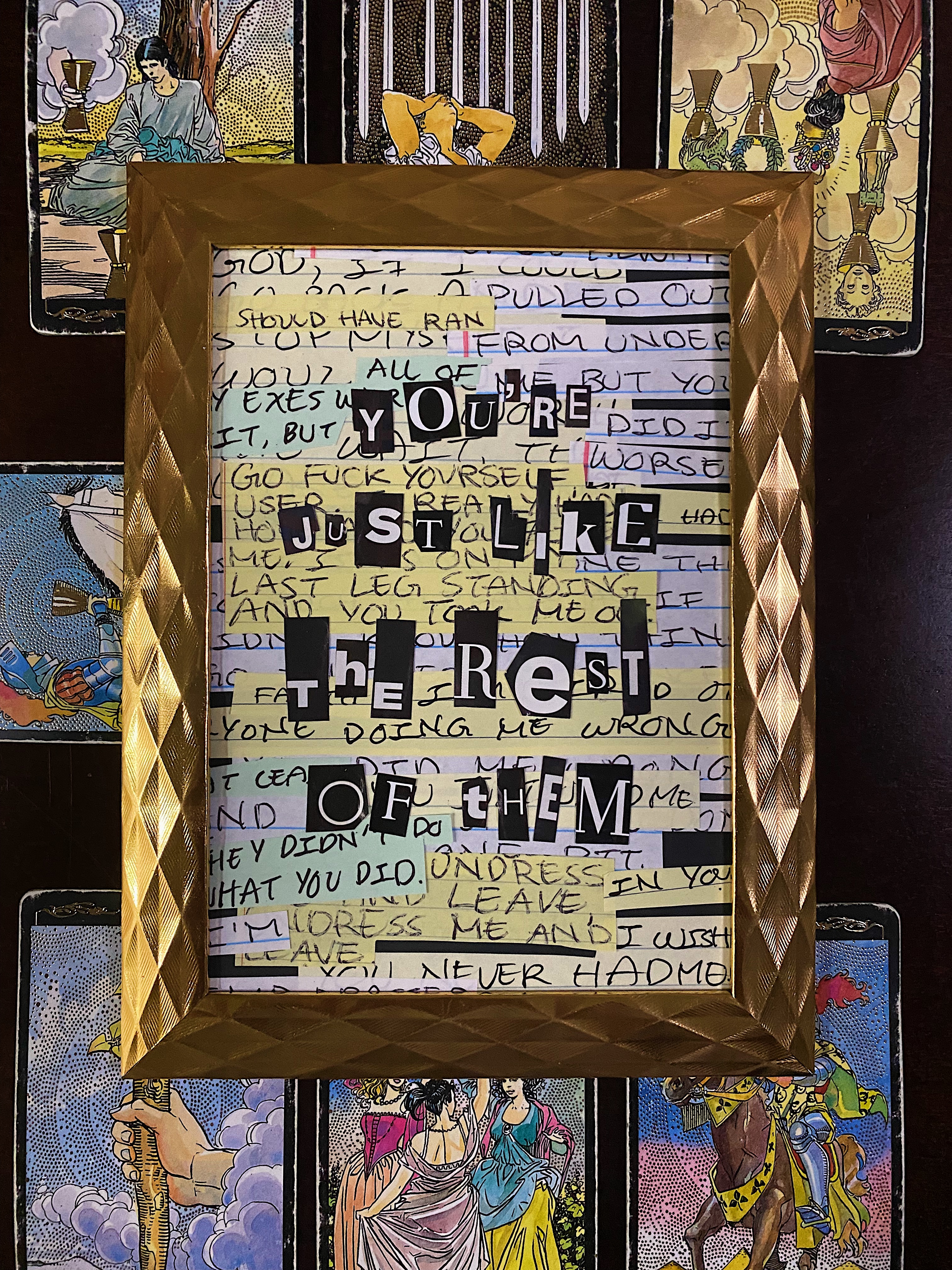 Collage series that gathers difficult inner truths, piecing them together letter by letter into words, demanding them to be confronted and seen in their golden frames.